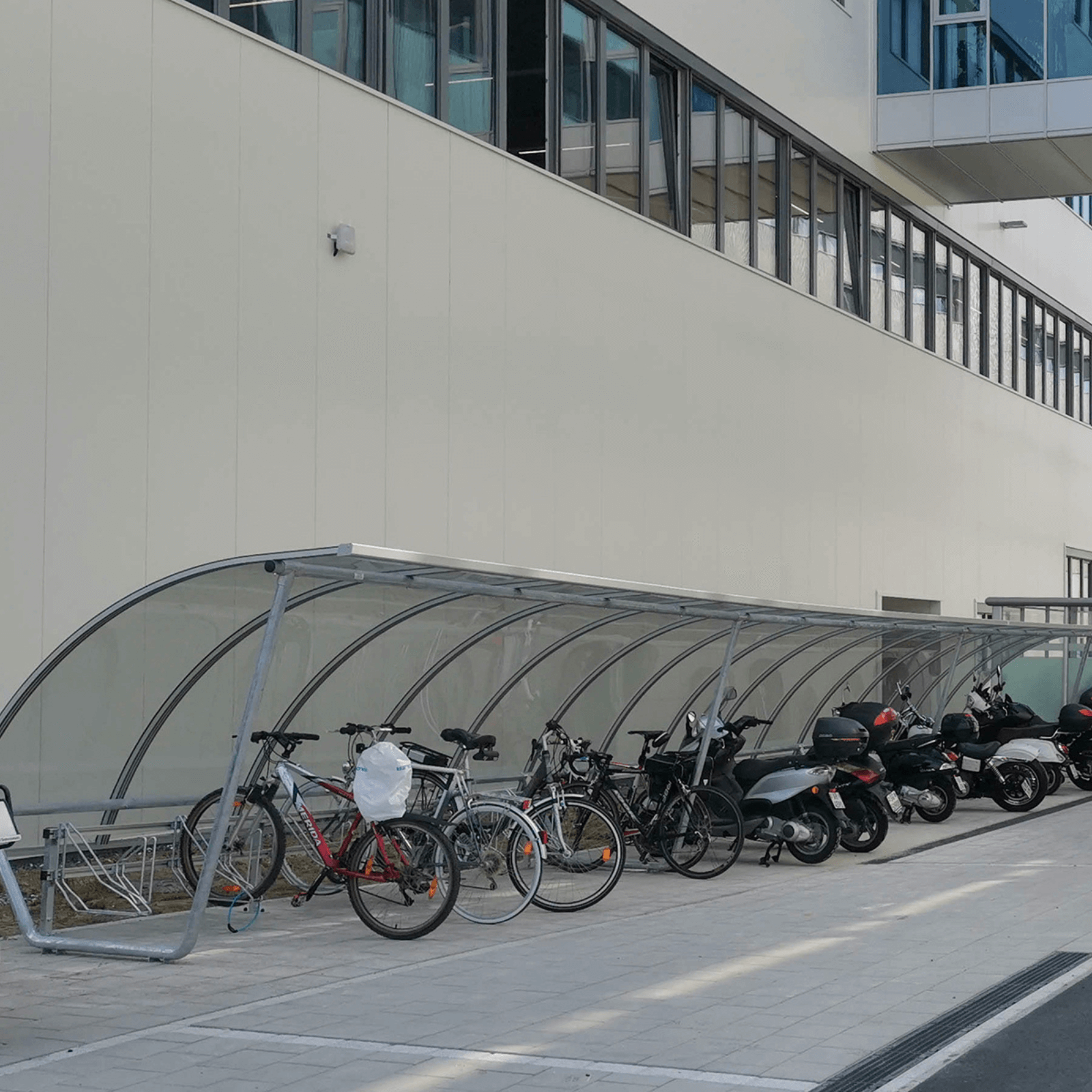 Pensilina elegante con struttura tubolare ideale per biciclette e motocicli.